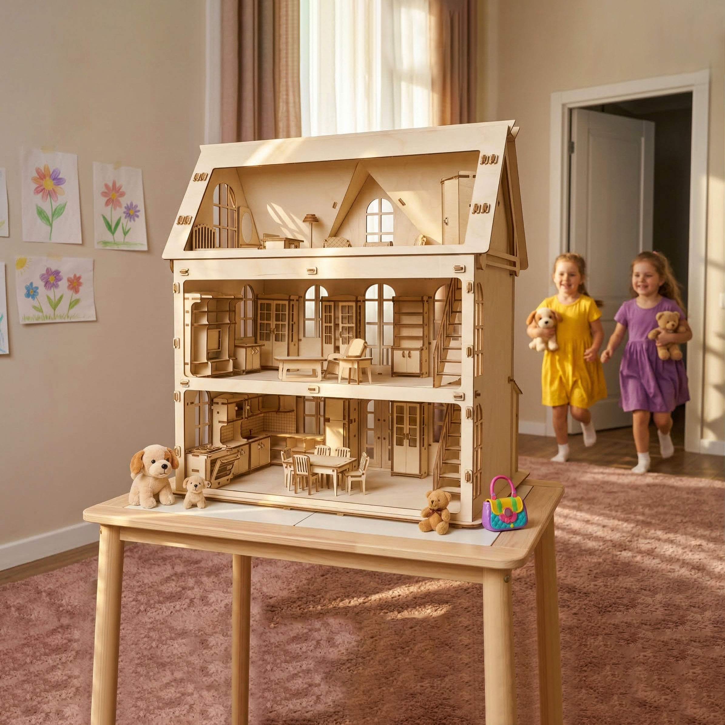 Этот шикарный сборный дом состоит из натурального и безопасного материала - дерева. Дом полностью открыт с его задней части, что позволяет беспрепятственно управлять героями и расставлять мебель по комнатам.
