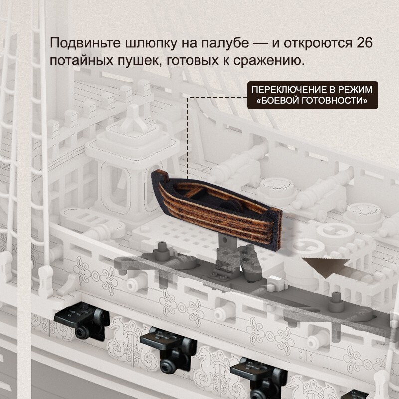 Подвиньте шлюпку на палубе — и откроются 26 потайных пушек, готовых к сражению. Этот механический элемент придаёт модели интерактивность и добавляет сюрприз при демонстрации.