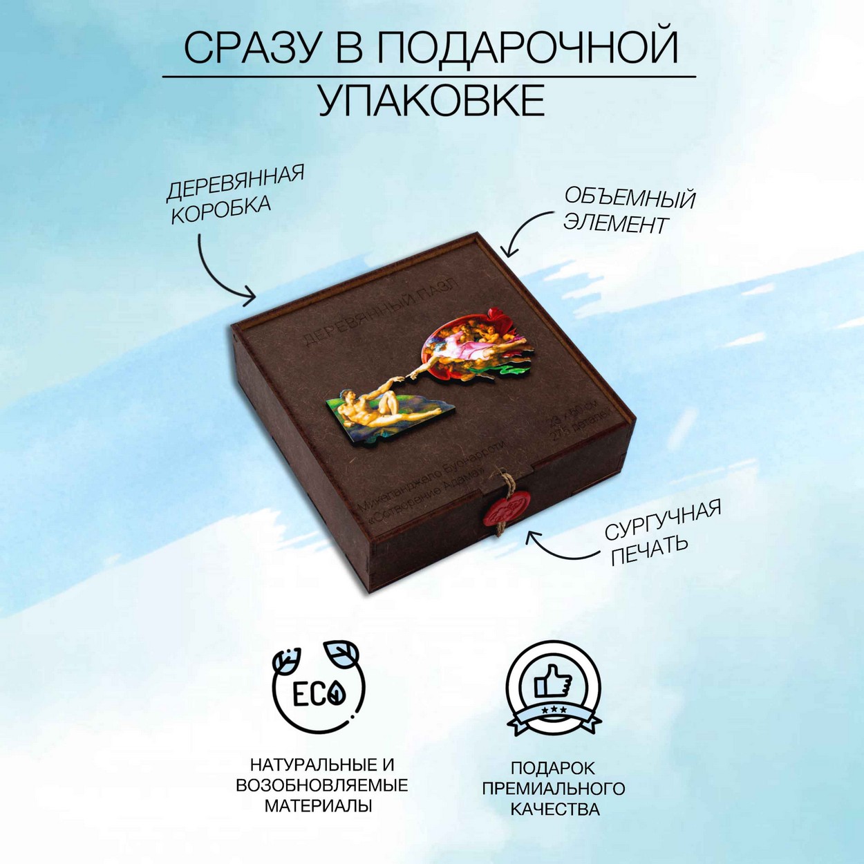 «Сотворение Адама» от Woodzle это не просто пазл, это развивающая головоломка со спрятанными секретами и историями. Сборка которого будет интересна как взрослым, так и детям. Расскажите историю о сотворении этого шедевра тем, с кем будете собирать пазл. Прививайте детям интерес к искусству с детства, пусть они учатся и познают новое через игру.
