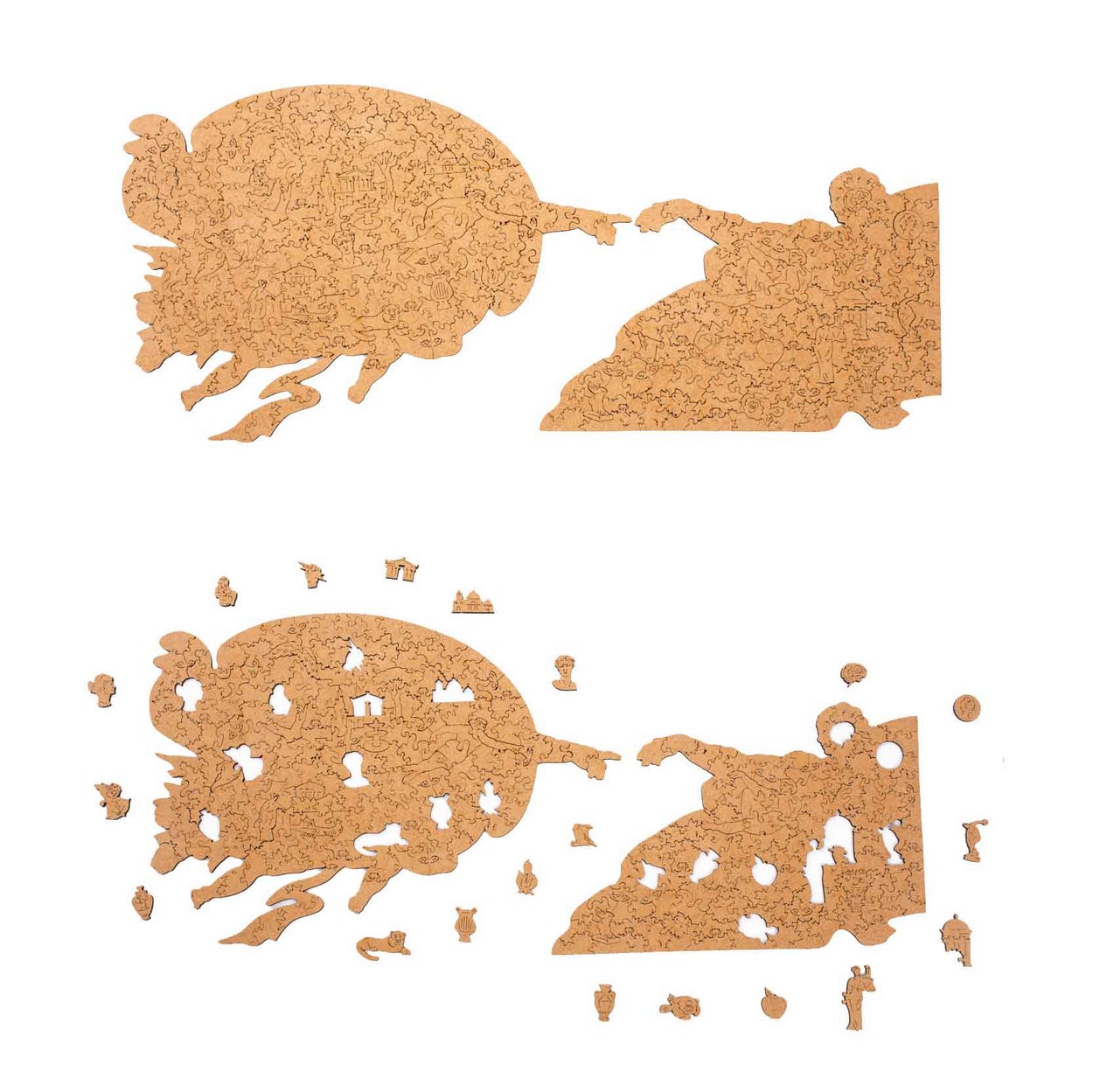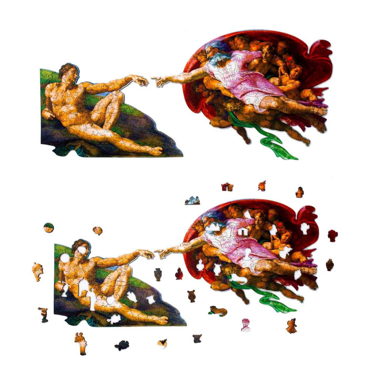 В процессе сборки картины Сотворение Адама от Woodzle, вы будете встречать множество секретов из истории, скрытых в резе деталей пазла, интересные формы, античные статуи, древние амфоры, божественные символы, а также самого купидона и Адама.